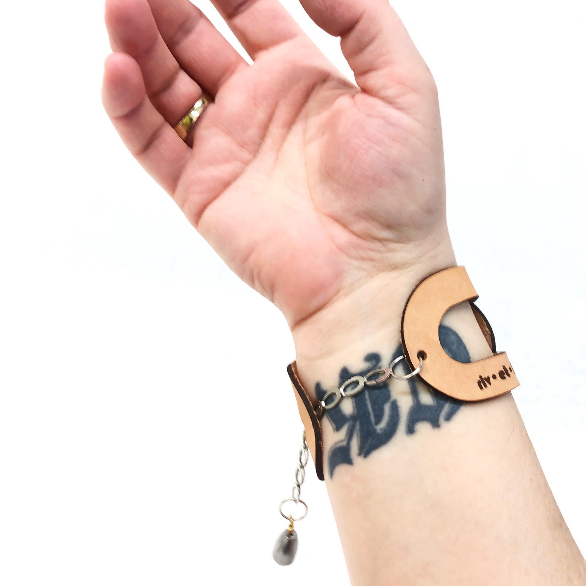 Made from ethically and sustainably sourced VegTan* leather that has been laser engraved, and moulded to hug your wrist with a 3" chain and weight to make sure you know it's there.