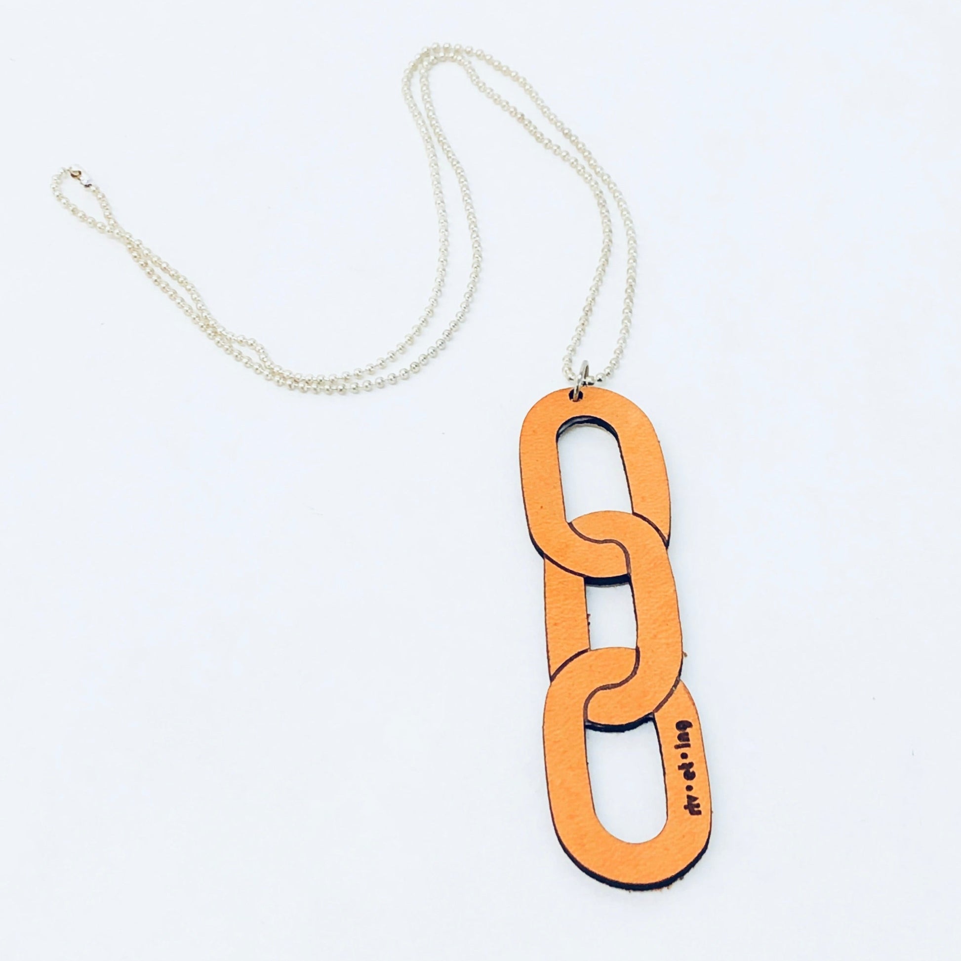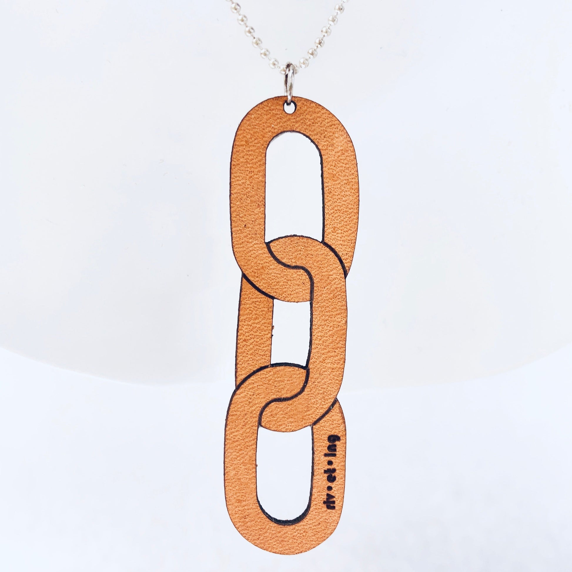 Made from ethically and sustainably sourced VegTan* leather that has been laser engraved. The pendant is 3" long and is on 1.5mm (1/16") 100% recyclable stainless steel ball chain which has a 12" drop.