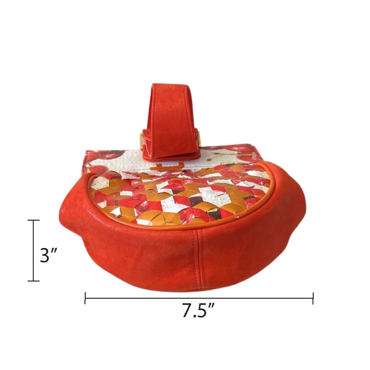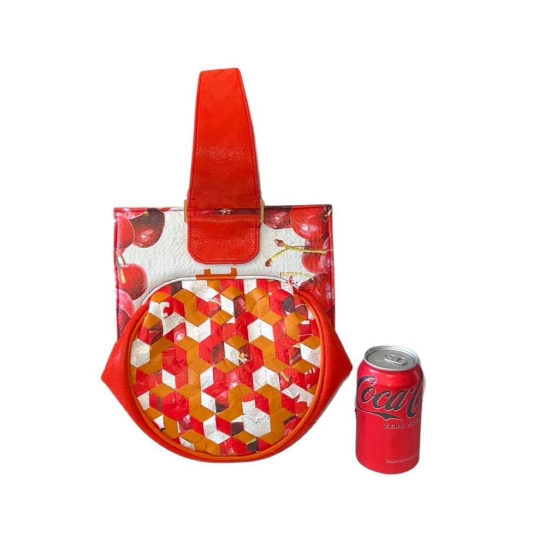 Materials: Upcycled "cherries and peaches" FreshDirect bag, tomato nubuck (nubuck is often confused with suede, but is actually stronger and more durable), orange tie-dye cotton, and brass hardware.